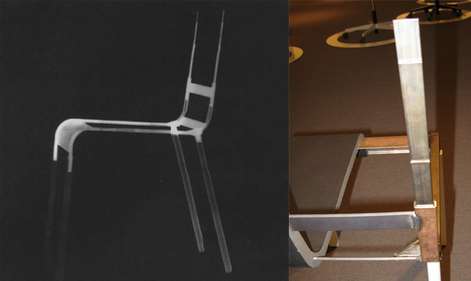 « La chaise .03 a en fait été conçue par Maarten Van Severen dans son propre studio avant de travailler avec Vitra. [...] Avant la .03, il y avait les chaises .01 et .02. [...] La chaise .02, en métal et en bois, avait déjà la forme de la .03 (cf. ci-contre). Bien que similaires dans leurs caractéristiques principales, ces deux chaises sont radicalement différentes en termes d'artisanat et de méthodes de production.