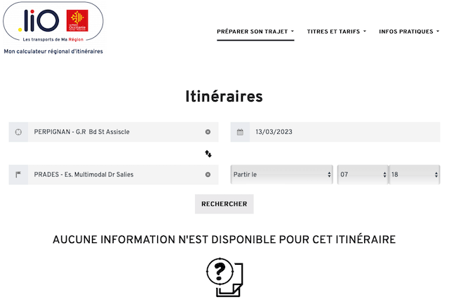 Clairement, pour une raison personnelle : n'ayant pas de voiture, lorsque je suis à Vernet je profite du formidable réseau de transports en commun qui dessert (presque) gratuitement toute l'Occitanie. J'ai donc besoin d'un calculateur d'itinéraires. Mais, me direz-vous, la Région ne propose-t-elle pas déjà une application spécialement dédiée ? Oui, c'est l'app et le site de Lio.