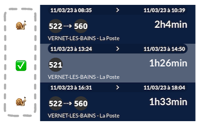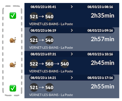 Seul le deuxième est optimal (je l'ai marqué d'un « ✅ »). Les deux autres (marqués d'un « 🐌 ») sont plus lents que nécessaire : le premier pourrait arriver à 09:59, soit 40 mn plus tôt ; le dernier pourrait arriver à 17:59, soit 5 mn plus tôt. Enfin, deux départs sont manquants, à 10:31 et 16:31. Pour comparaison, les cinq trajets optimaux trouvés par mon calculateur, et vérifiés sur les fiches horaires :