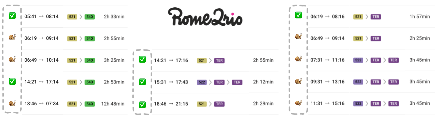 On voit que Rome2rio est réellement multimodal, et ne propose pas moins de treize trajets, soit deux de plus que ceux listés plus haut. Cependant, plusieurs s'avèrent trop lents (07:31, 09:31 et 11:31) et/ou redondants (deux départs à 06:19, 06:49, 14:21 et 18:46). En outre, les trajets optimaux suivants sont manquants :